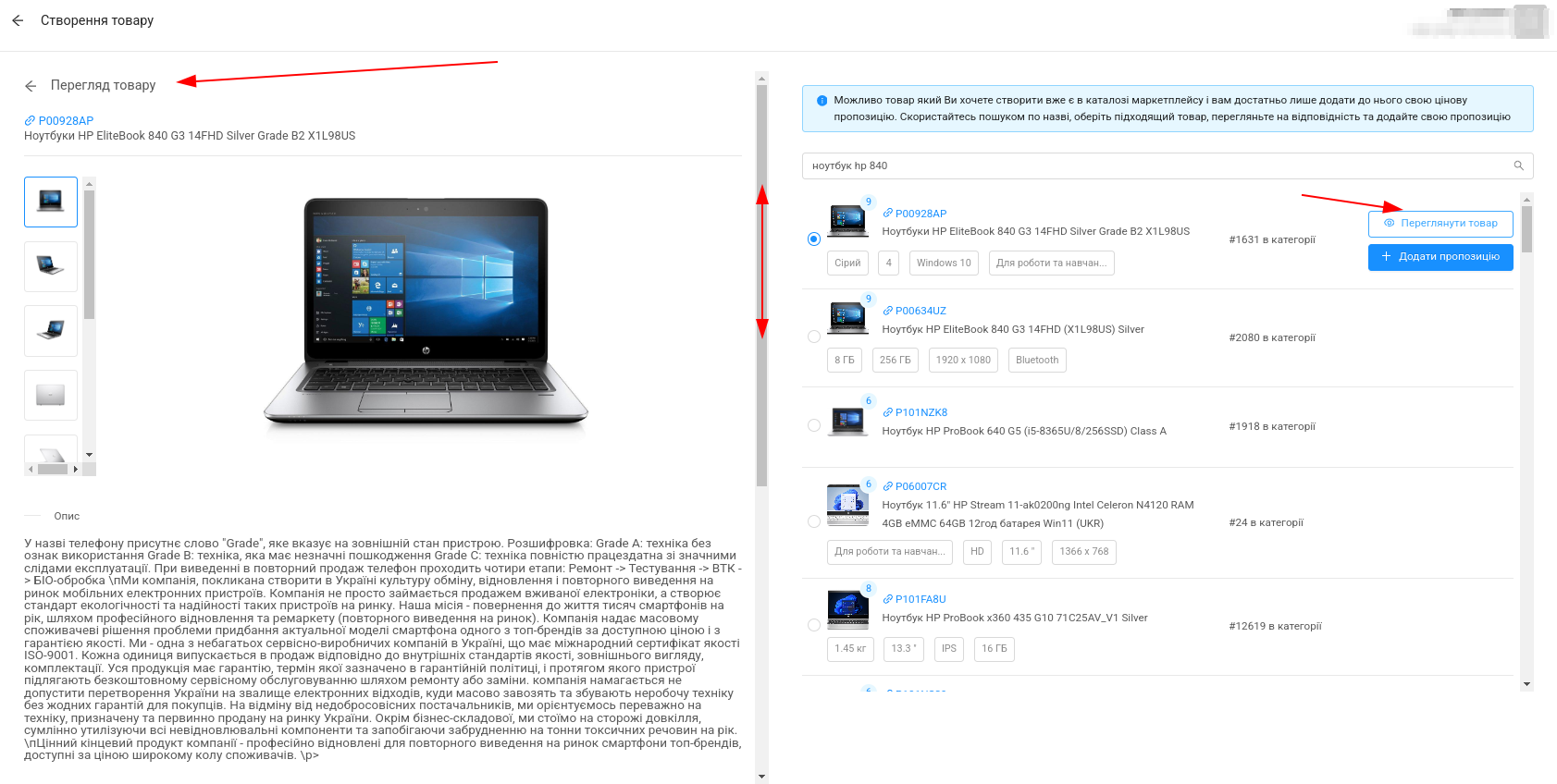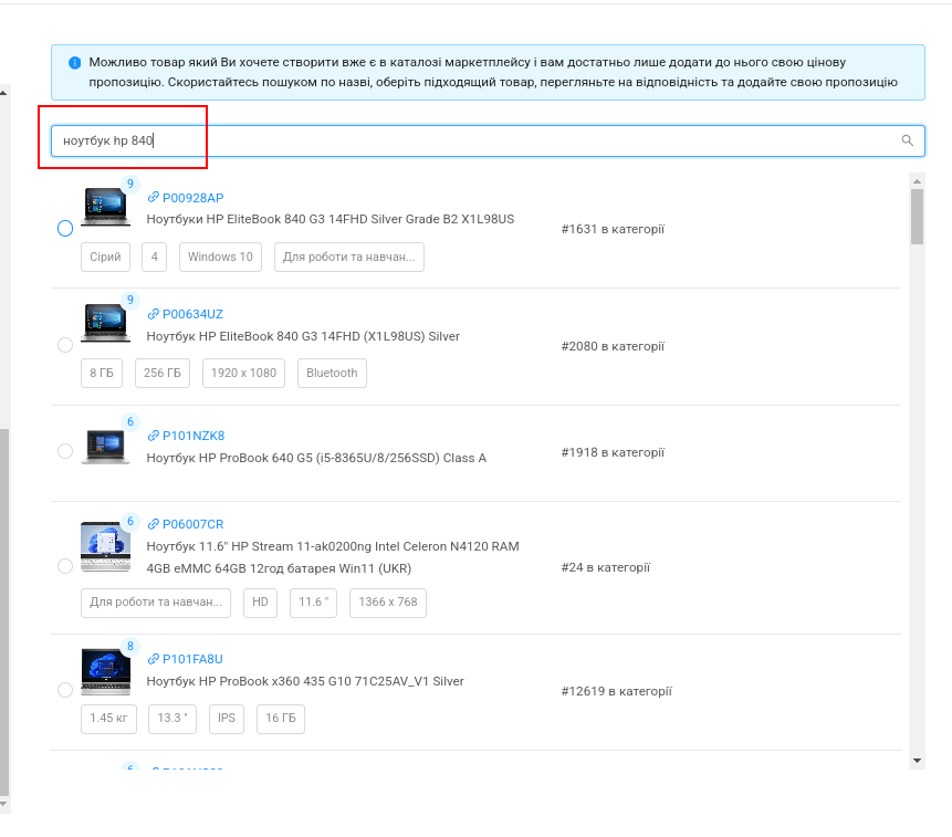 Важливо! Під час створення Пропозиції Вам необхідно вибрати зі списку товар 1:1, який відповідає Вашому.